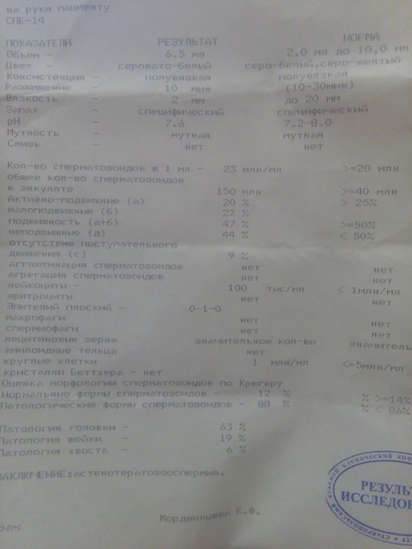 Как это все? Все как раз у вас нормально! Я не понимаю почему они написали такой диагноз при морфологии по Крюгеру 12 !!!! %. По Крюгеру норма более 4%! Странная лаба, пересдайте в другом месте! 14% нкоторые они написали нормой не попадаю т в нормы ни по Крюгеру, ни по ВОЗ