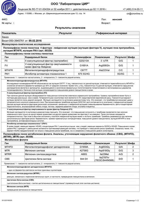 >>> MTR A2756G - ((норма А/А))G/G -РИСК,ГОМОЗИГОТА РЕДКИЙ АЛЛЕЛЬ.ПРОЯВЛЕНИЯ ГЕНОТИПА:Рост уровня гомоцистеина в крови,повышение риска развития синдрома Дауна,нарушение развития плода-незаращение нервной трубки плода. >>>>>