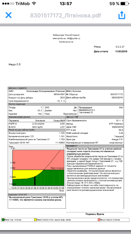 Всё о нашей беременностиЭто что ??? Один шанс из 191 что у ребёнка не будет трисомии 21??!! Что ещё за возрастной риск?? Мне же не 50, а 28!