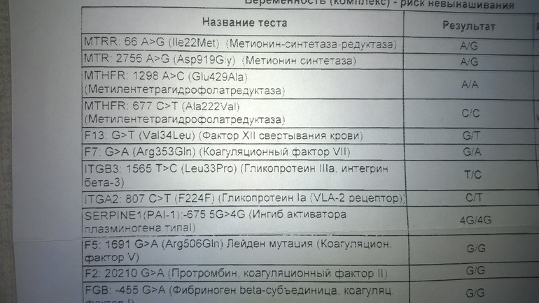 У Вас имеются мутации фолатного цикла в гетерозиготе (две верхние), в этом и причина высокого гомоцестеина. Желательный показатель для беременности не больше 6. Я снизила его ангиовитом и нейромультивитом, за месяц упал до 5.