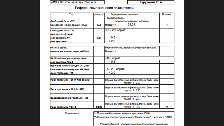 Блин, честно нифина в этом не понимаю... Но понимаю, что видимо есть риск и понимаю как тебя сейчас колбасит. Держись, я уверена что все хорошо с лялечкой, ох уж эти риски. Я свои результаты в глаза не видела и слава богу. По узи же все хорошо. Обычно, если есть грубые пороки, там и воротниковая зона сразу плохая и по органам видно. Может, попробовать пересдать?