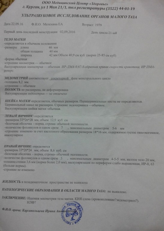 Ишемия матки, эндометриозная киста левого яичника, и под вопросом кровоизлияние этой кисты, эндометриоз и НЛФ (недостаточность лютеиновой фазы) является одной из частых причин бесплодия у женщин). Т.е. НФЛ- как одна из прчин неудачливых имплрнтации.