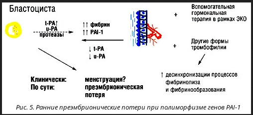 Ранние преэмбрионические потери в основном связаны с дефектами имплантации плодного яйца. Процесс имплантации начинается на 6-й день после овуляции и представляет собой не односторонний процесс активной инвазии, а своеобразный энзиматический "обмен" между бластоцистой и эндометрием, для которого необходима гормональная стимуляция и определенная "зрелость" эндометрия. В процессе подготовки к имплантации под влиянием прогестерона в эндометрии происходит повышение содержания ингибитора активации плазминогена типа 1 (PAI-1), тканевого фактора (TF) и снижение уровня активаторов плазминогена тканевого и урокиназного типов, металлопротеаз матрикса и вазоконстриктора - эндотелина 1. Эти физиологические механизмы регуляции гемостаза, фибринолиза, экстрацеллюлярного матрикса и сосудистого тонуса направлены на предотвращение образования геморрагии при дальнейшей инвазии трофобласта. Со своей стороны, бластоциста синтезирует активаторы плазминогена тканевого и урокиназного типа и протеазы, которые необходимы для разрушения экстрацеллюлярного матрикса в процессе имплантации. Их излишний синтез, в свою очередь, регулируется хорионическим гонадотропином (ХГ). В процессе "дозированного" разрушения матрикса под действием ферментов, выделяемых бластоцистой, клетки эндометрия, которые содержат определенное количество экстраваскулярного фибрина, не фагоцитируются, а как бы "отодвигаются" посредством "контактного ингибирования". Эта фаза процесса имплантации носит название "аваскулярной" или иначе - "гистиотрофной". Следует отметить, что это наиболее уязвимая фаза имплантации: часто такие факторы, как вирусы, токсины, антитела и пр., могут непосредственно влиять на полноценность имплантации. С точки зрения влияния тромбофилии наиболее ярким примером являются полиморфизм PAI-1 и другие генетически обусловленные дефекты фибринолиза и АФС