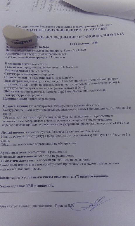 В ноябре планируем вступать в протокол, теперь переживаю что киста желтого тела не рассосется! Что делать чтобы она ушла? Что попить? Врачу не звонила не сообщала, но она мне до этого назначала пить прогинову с 21 дц по 2 таблетки 7 дней, дабы мои фолликулы были равномерные. Так хочется уже вступить в протокол. Вот картина