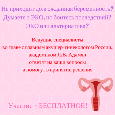 Клиники,врачи,санатории (отзывы и рекомендации)4 июня 2017 года состоится бесплатная встреча «ЭКО. Актуальные проблемы и достижения», на которой будут подниматься самые актуальные вопросы: в каких случаях прибегать к данной процедуре, всем ли она доступна, какова эффективность и кому экстракорпоральное оплодотворение необходимо, что важно знать о будущем здоровье ребенка, какие последствия и осложнения могут быть. Также будут затронуты темы онкологии, мужского бесплодия и альтернативные методы лечения.