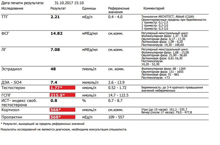 Тестостерон надо было сдавать свободный, обычный показывает превышение, кортизол повышен - гормон надпочечников(его правильно сдавать в суточной моче, так утром случается его скачок). ГСПГ смотрят, чтобы он ниже не был, это глобулин, связывающий половые гормоны, он связывает тестетерон и остальные гормоны и выводит их, поэтому я написала, что надо смотреть свободный тестостерон. Значения не критичные быстро приводятся в норму. Пролактин тоже там проводится дополнительный анализ, чтобы узнать, надо ли его снижать. На какой день сдавали ФСГ? если на 2-3, то нужно проверить АМГ, чтобы не было истощения.