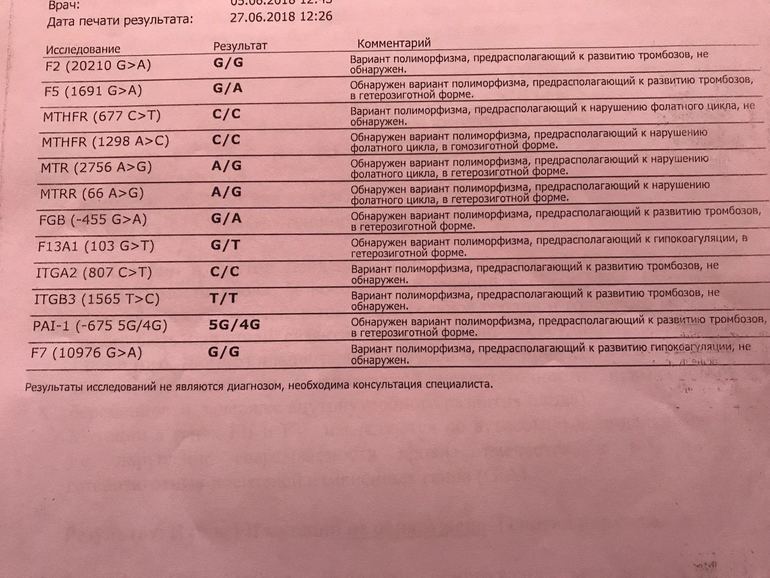 Я надеюсь что ошибаюсь, но по- моему у вас Лейден в гетерозиготе и PAI тоже сломан, это не очень сочетание, высок риск тромбозов. И мутации фолатного цикла, нужно постоянно пить фолиевую. Сдайте ещё гомоцистеин, он обычно повышен при поломках фолатного цикла, в идеале должен быть не больше 6.
