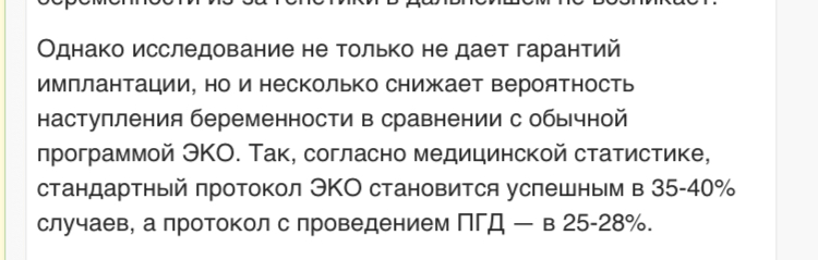 Могу предположить, что здесь имели в виду % от оплодотворенных яйцеклеток, а не от переносов. ПГД всех эмбрионов "бракует" часть до переноса, поэтому и % успеха ниже. А если пересчитывать на % от числа переносов, всегда встречались данные о том, что сильно повышает (что логично).