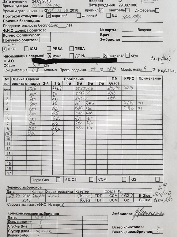 Все об эмбрионах (+ПГД и Хэтчинг)Девочки,всем привет! Ездила на прием к ре, забрала свой эмрио лист. И здесь меня ждал огромный сюрприз, которого если честно я даже не ожидала-у нас 2 эмриона ушло в крио!!!!!!!!!! Когда я приезжала на перенос, то ре мне говорила, что один эмрион был на стадии ранней бластоцисты и если он продолжит делиться, то его заморозят,но тут выяснилось, что заморозили 2 !!!До этого ни одного эмриона до крио не доживали.Девочки, кто разбирается посмотрите пожалуйста лист. Я правильно понимаю-в крио у нас 2 хорошиста? И оплодотворение было только ЭКО, без ИКСИ?