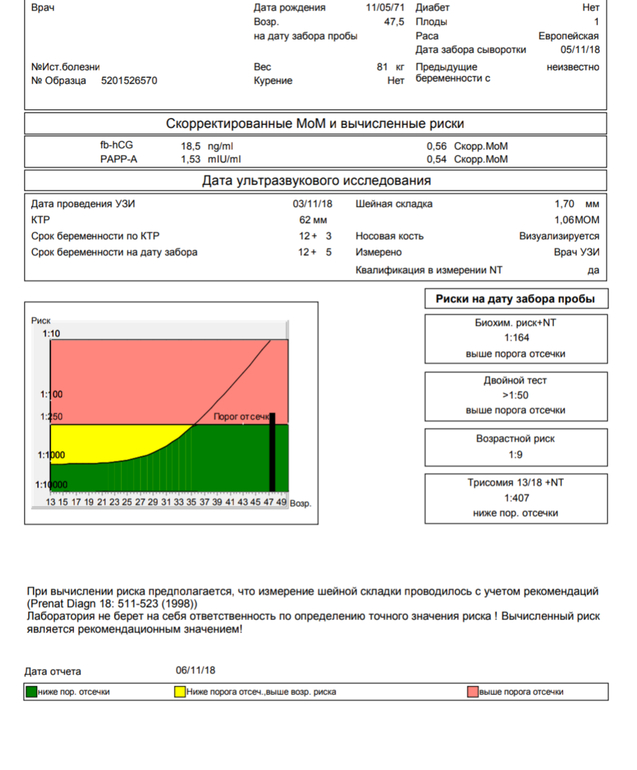 Я конечно не спец по дальнейшим тестам. Но дело не в возрасте только. Моя яка была взята в 43 года, а риски все по крови были низкие. Я бы в данном случае копала дальше. Ну и надеюсь, что ты юридически обезопашена. Держу кулачки за вас, пусть здоровенький будет.