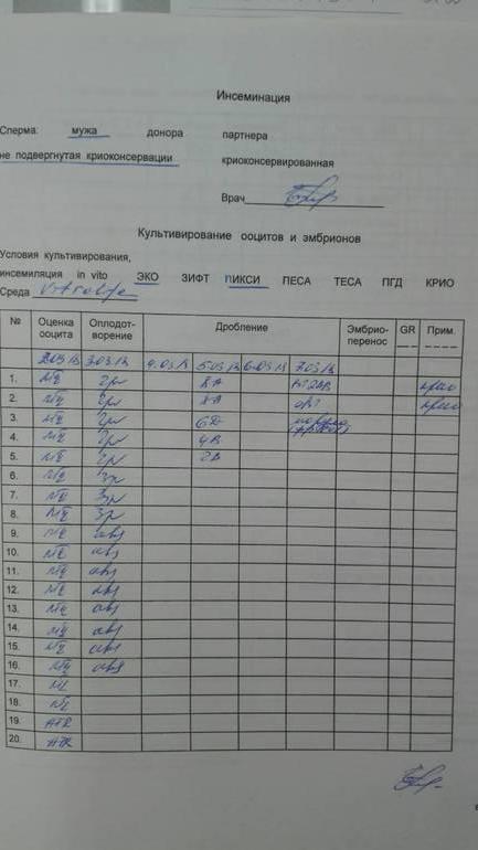 Не очень хорошо видно оценку ооцитов. Но видно что 16 из 20 оплодотворились и только 5 дожили до 3 дня 2 из них отличника, остальные на троечку.