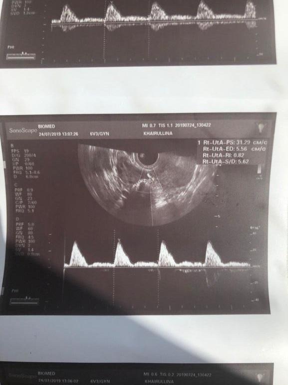 1.Правая маточная артерия 2.Левая маточная артерия 3.Аркуатные артерии 4.Радиальные артерии 5.Базальные артерии 6.Спиральные артерии Наиболее важные для имплантации и вынашивания на первоначальном этапе и наиболее часто страдающие от ХЭ артерии - это Базальные и Спиральные. Пока кровотока в них нет, или он снижен, беременность может продолжать срываться/замирать. Правая и левая маточные артерии не столь важны для вынашивания на первоначальном этапе. Однако обычно с ними как раз у большинства все в порядке. Во время измерения сосудов, на экране монитора будут ловить пульсацию в каждой артерии, и вы будете видеть примерно такую картинку: УЗИст же будет замерять эту пульсацию. Это правильное исследование. Часто доплером называют еще вот этот "режим цветных пятен": Это тоже кровотоки в режиме доплера. Многие УЗИсты просто смотрят именно этот режим доплера и сообщают вам, что все хорошо. Не ведитесь! Информации о скорости кровотоков такое исследование не несет. Когда делать доплер? Доплер сосудов матки необходимо делать на 5-7 ДПО (день после овуляции). Нормы доплера есть на любой день цикла, и в принципе узнать о плохом кровотоке вы можете, сходив на доплер в любой ДЦ. На 5-7 ДПО его смотрят за тем, что это время приходится на окно имплантации при возможной беременности. Какой нужно получить результат от УЗИста на руки? Правильный результат доплера выглядит как все перечисленные выше артерии с количественными показателями, включая самый популярный - Индекс Резистентности (ИР). (Или только с ИР, этого достаточно). Если по-английски, то RI. Данный индекс характеризует скорость кровотока и имеет свои нормы. Резистентность - это сопротивление, то есть чем ИР ниже, тем лучше, тем быстрее кровоток, а значит лучше для беременности. То есть когда говорят о высокорезистентном кровотоке, имеют ввиду, что кровоток плохой. Соответственно, на руки вам должны выдать результат ИР во всех шести артериях матки и вывод УЗИста о состоянии кровотока. Каковы нормы доплера? Нормы ИР для второй фазы цикла: