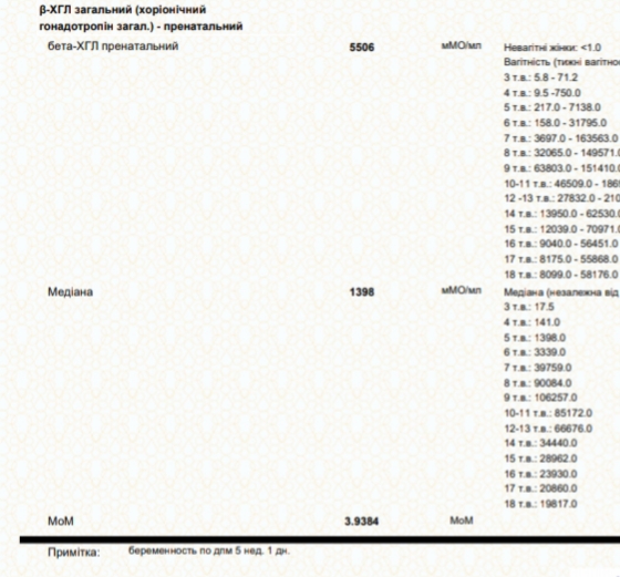 Медиана является средним значением уровня маркера при нормальной беременности того же срока гестации и обозначается Моm (multiples of median).