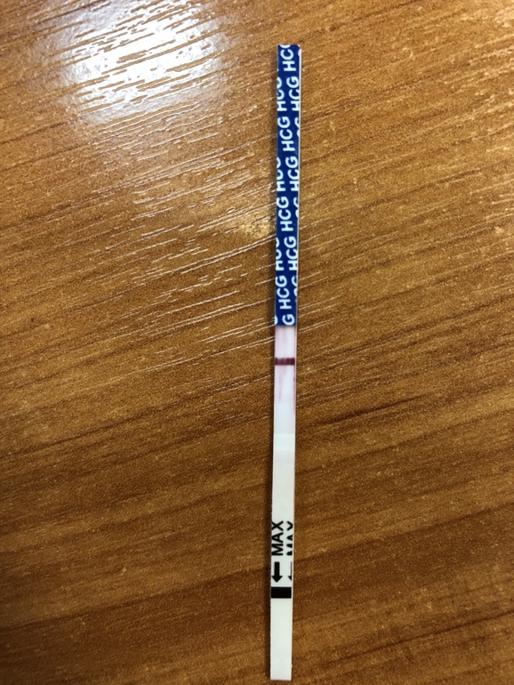 мне кажется оно, вы его передержали, поэтому растекся, но полоску видно хорошо, широкая и розовая. Если хгч нет в моче, то хоть замочи на час, полоски не будет, только возможно серый реагент.