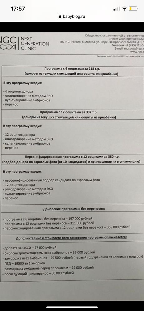 Все в голове каша... выбрала ngc москва записалась к лабоде... по цене получается 12 оцитов 332 000 руб + доплата за икси 27 000 руб + заморозка Всех эмбрионов 29 500 итого 388 500 руб ( не знаю конечная ли сумма это или еще что то вылезет) ? в питере позарилась на акцию 10% эко с дя! Акция действует только на замороженные (не мой вариант 😒) Записалась к забелкиной буду делать свежие.. по цене получается :12 оцитов - 308 000 руб ( икси включино) + криоконсервация 25 000 руб + обследование 10 00 руб и того 343 000 рубДумаю теперь где??