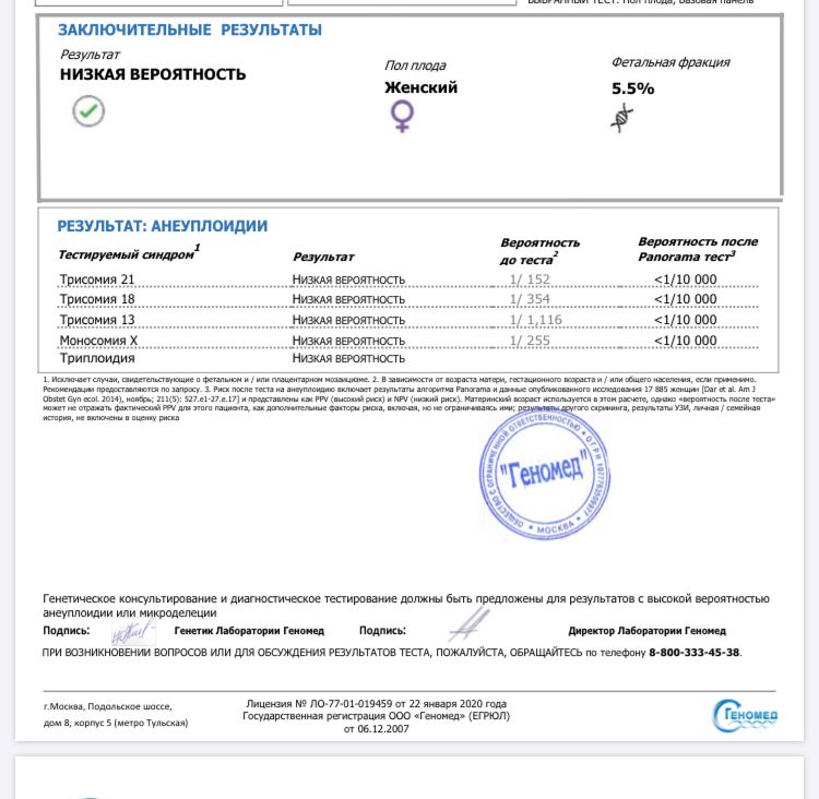 Изначально собиралась сдавать НИПТ, сделала в геномед панараму США на 8 синдромов, ответы пришли быстро , первый лист все понятно - риски низкие, второй лист не поняла😬 (расшифруйте кто нибудь пожалуйста).