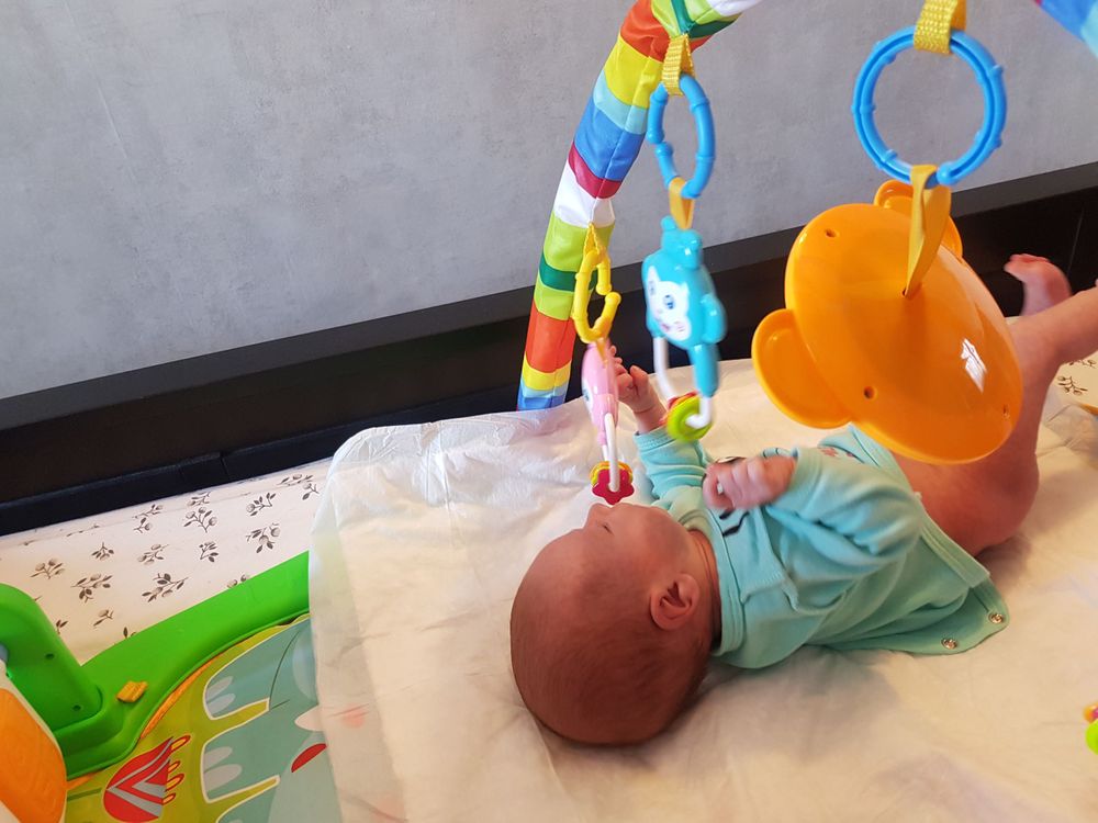 Что мы умеем: лежать на животе и держать голову(особенно после массажа), пытается перевернуться но не получается, уже видит игрушки и пытается их трогать, держит бутылочку когда кормим его, стал хватать меня за волосы, держит мои и мужа пальцы, реагирует на звуки разные.
