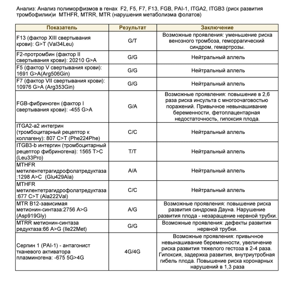 Ну у меня тоже паи1 и ф13 (т/т даже) клексан по ним. FGB наверно даже не сдавала. а ещё MTR и MTRR не знаю - по ним какая терапия, можкт просто клексана достаточно. у меня MHTFR - полная мутация - там метилфолаты нужны