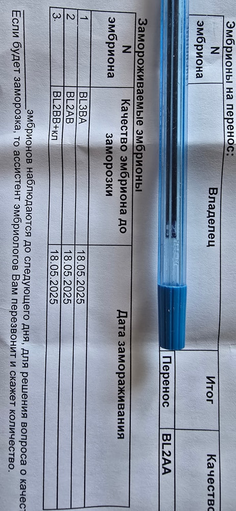 У меня оставался единственный 2bb, его перевозили 2 раза, и повторно замораживали-размораживали, т.к. были на одной соломинке, а переносили по одному. Удача! И Вам того же желаю, верьте в своих малышей!