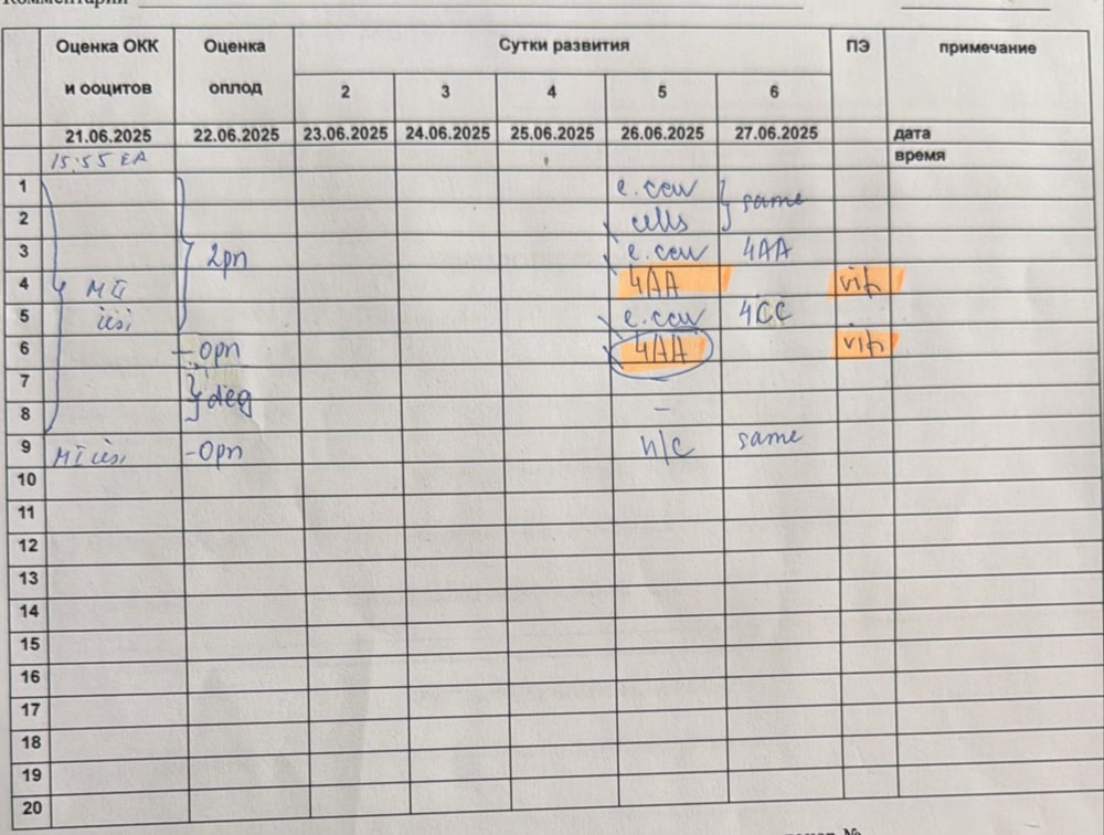 Все об эмбрионах (+ПГД и Хэтчинг)Девочки сегодня прислали эмбриологический лист, по 4 эмбрионам все поняла, а вот по первым двум нет, что обозначает сокращенные слова, подскажите.