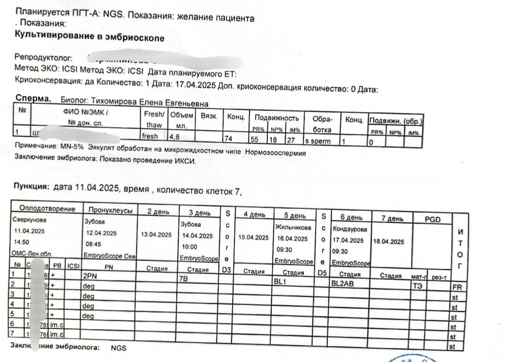 1й: апрель 2025, стима со 2 д.ц. Препараты: гонал 187.5, оргалутран, триггер Овитрель. Пункция на 12й день стимы. Зрело 11, взяли 7, получили 1 эмбрион (пгт - моносомия 18).