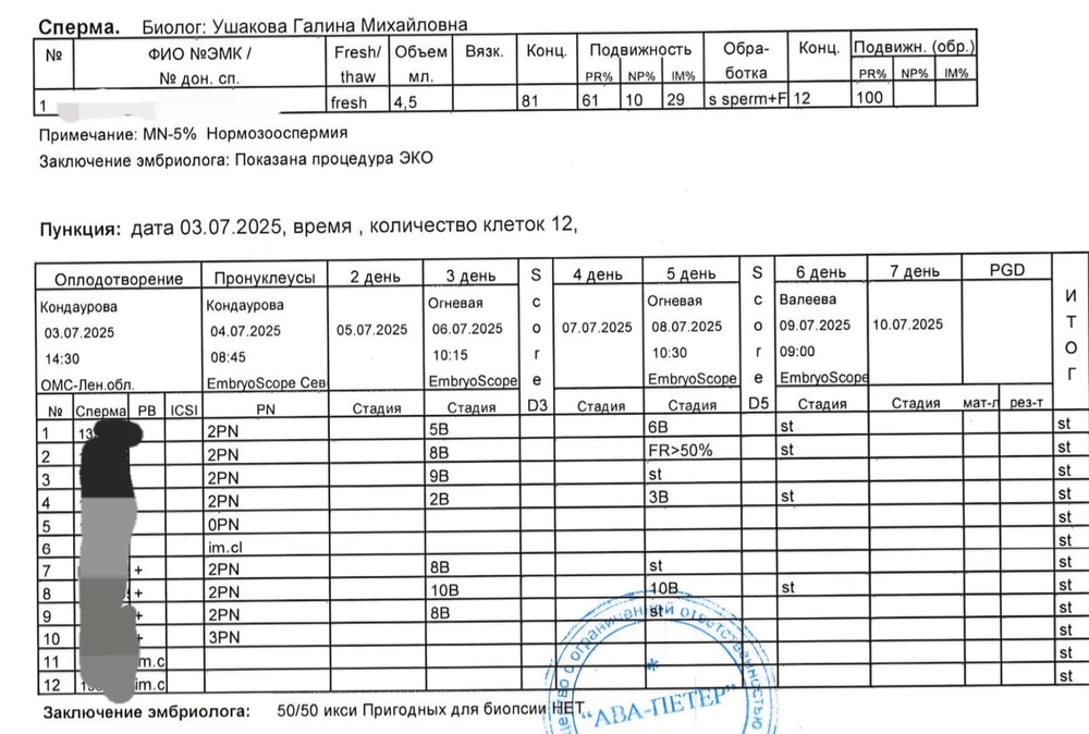 2й: июнь 2025, перед протоколом прогинова с 22 д.ц по 4 д.ц, стима с 6 д.ц. Препараты: гонал 75 + перговерсис 150, цетротид, двойной триггер Декапептил+Овитрель. Пункция на 13й день стимы. Получили все 12 клеток, 7 правильно оплодотворились (4 методом эко, 3 икси). На 3й день картина была хорошей, а вот на 5й осталась такой же как на 3й. Все остались бластомерами, на 6й ожидаемо замерли.