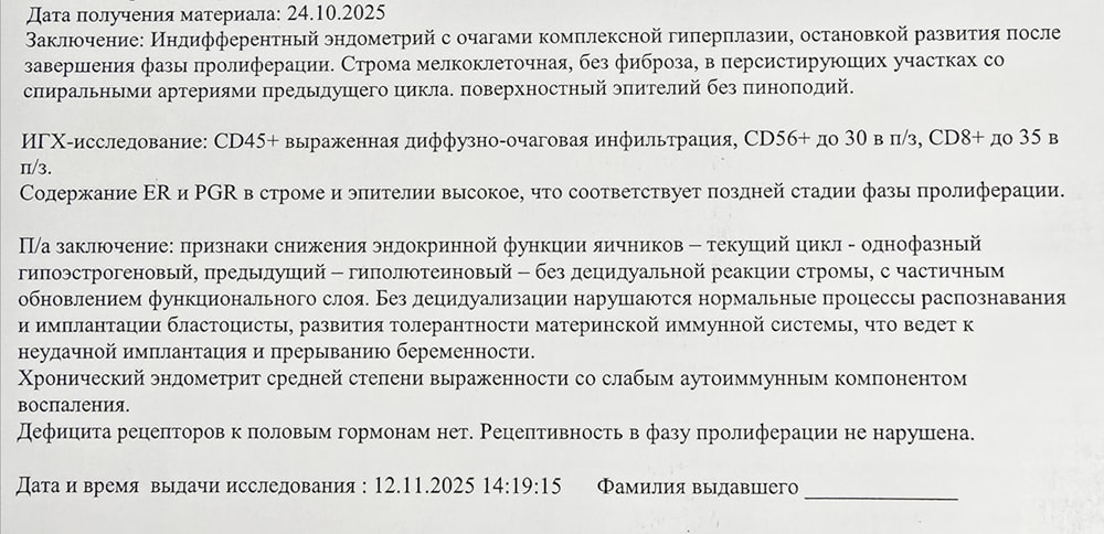 Эльза, ИИ сказал, что эндометрий не готов к переносу в момент пайпель. Типа недостаточно прога было, что бы он был как нужно. А Хр. Эндометрит он у всех есть. Его никто не ищет и не лечит.