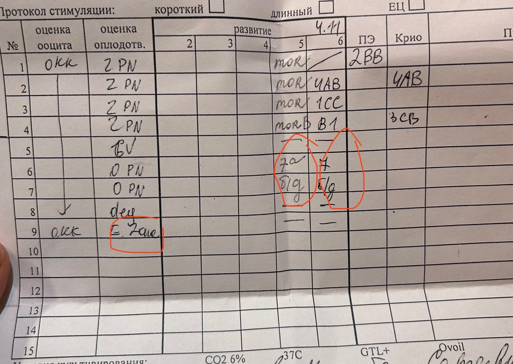Пунктировали 9 фолликулов. 4 яйцеклетки оказались зрелые. 2 незрелые. 3 негодные для оплодотворения. По итогу заморозили 2 эмбриона. По качеству один между отличником-хорошистом и один среднего качества (троечник). Как показывают истории на ББ, все эмбрионы имеют шанс стать здоровым малышом 😊
