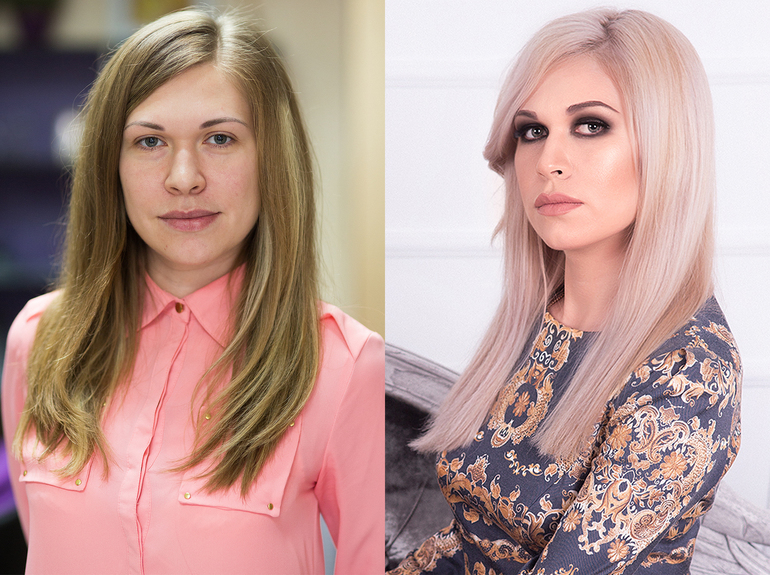 У Марины от природы светлый оттенок волос, поэтому с их окрашиванием не возникло проблем: красящее вещество легло довольно ровно, а получившийся цвет полностью соответствовал задуманному. Гладко лежащие волосы с минимальной подвижностью изысканно засияли на голове их обладательницы, создавая свежесть образа.