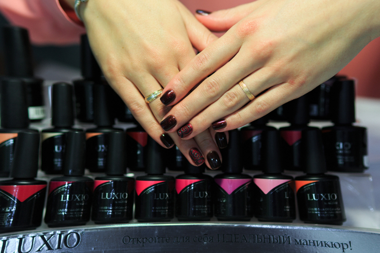 Нейл-мастер Наталья Хравинина выбрала для ухоженных пальчиков Марины покрытие ногтей винного оттенка "Чувственное бордо", который завершил получившийся образ героини.