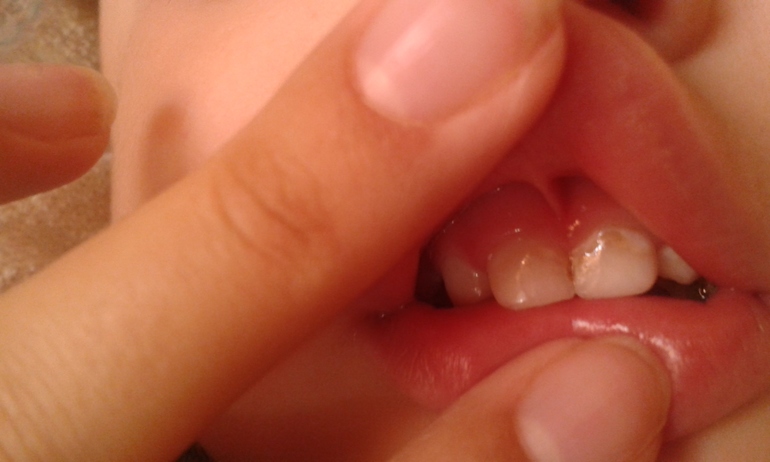 Добрый день, Алина Владимировна! Очень прошу посмотреть на фото наших зубов. Месяц назад увидела "налет" на верхних зубках, стали активно чистить после каждой еды Роксом, результата ноль, теперь есть дырка между передними зубами и скол зуба. Изучив Ваш дневник, поняла, что не фига не скол, и налет , а конкретный кариес. Вопрос в чем: можно ли поставить пломбу между зубами и избавиться от этого "скола"? И все это только под общим наркозом?