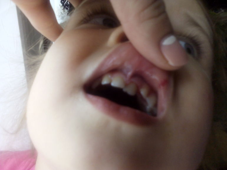 Здравствуйте, дочке 3.5 года, упала с кресла, рядом стояла мебельная стенка. Она ударилась об неё, и получилось что зуб вогнулся во внутрь. Сейчас начала праздниклв врачей нет, именно стоматолога хирурга, простой стлмотолог посмотрел сказал что зуб не сломан. Но сейчас прошло 6 часов с момента падения, и у неё собралась кровь под верхней губой. Что делать не знаю, нам выписали махать только холисал.