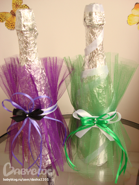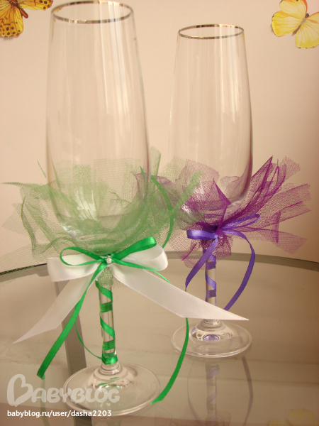 Аксессуары, украшения и обручальные кольцаВот такой получился декор бокалов и шампанского в продолжении зелено-фиолетовой свадьбы.Это бюджетный вариант-бокалы 200р/пара,шампанское 300р/пара.