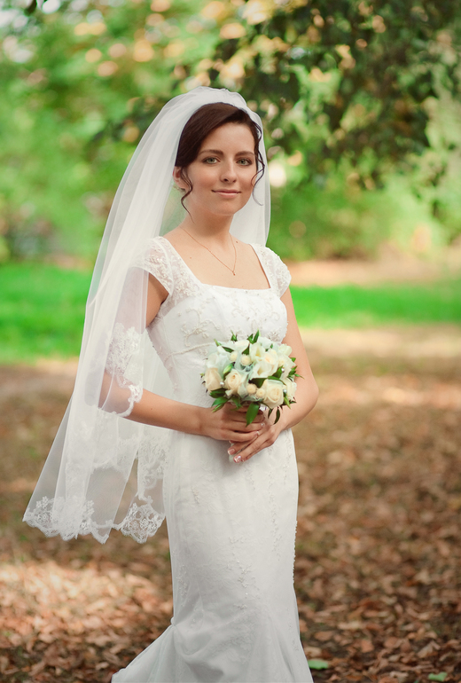 Фата заслуживает отдельным слов: она невероятно красивая, стильная, отлично смотрится с платьем, хотя это разные дизайнеры.