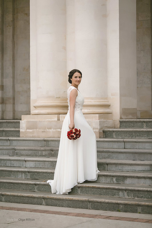 Изначально Оксана хотела высокую прическу, но потом, еще до репетиции, прислала фотографию, где была девушка в платье с низкой прической. Детали было плохо разобрать из-за посредственного качества, были видны только контуры. В итоге я предложила вариант, держа лишь силуэт в голове.