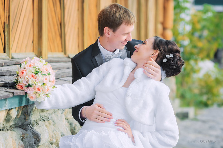 Решено было отталкиваться от романтического свадебного образа - классическое белое платье из легкого и струящегося материала, фата, собранная прическа из локонов, нежный и выразительный макияж, букет в пастельных тонах.