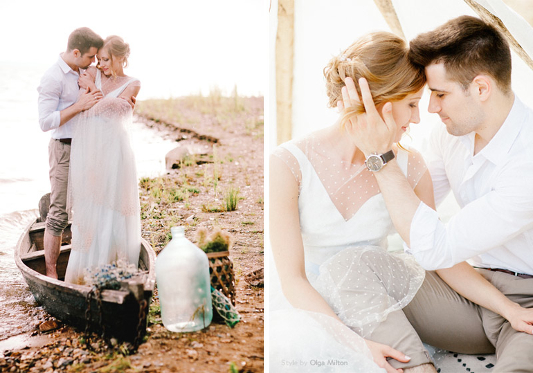 Когда невеста обратилась ко мне - мы поставили задачу создать образ, который гармонично соединился бы с атмосферой теплого воздуха, необжитого побережья озера и бесконечной романтики.