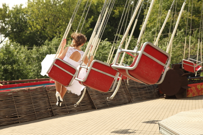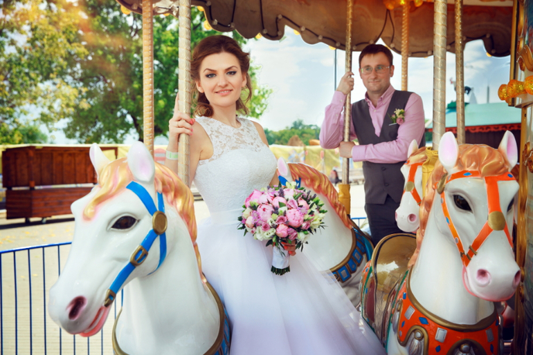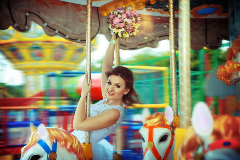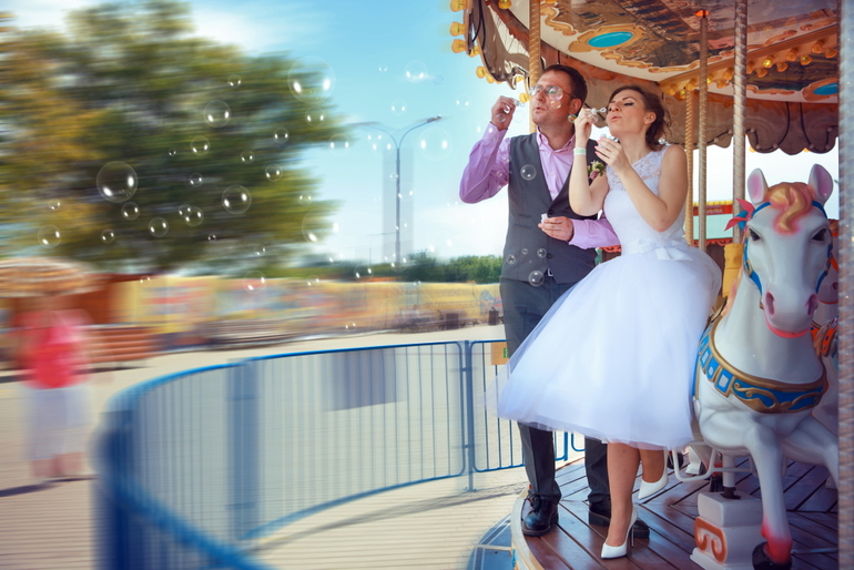 Круг за кругом... Весело, по-детски кружит нас карусель. Смех и радость... И немного мыльных пузырей. Яркими красками наполнится день, теплыми чувствами нальется душа. Летит фота, как по волнам, летят молодые в новую жизнь.