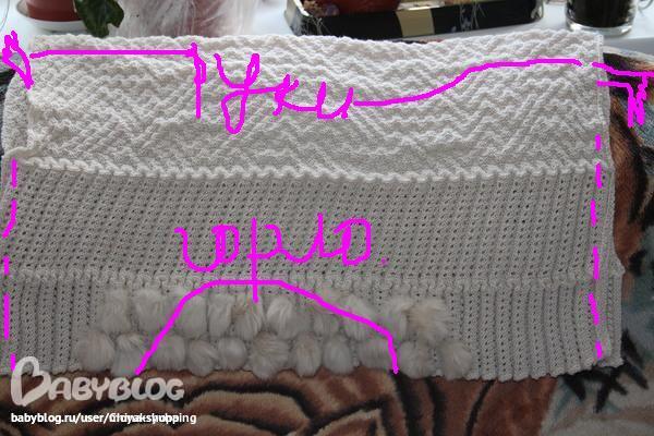 Я сообразила! у этого "шарфика" есть вырезы для ручек. а вот швы которые идут ниже, сразу от пройм (вертикальные) внизу должны быть полность зашиты. чтобы тот срез который у вас на фото внизу (горизонтальный)был полностью замкнут в один хомут. тогда точно соответствует фото. горловины нет. просто на плечи накидывается.