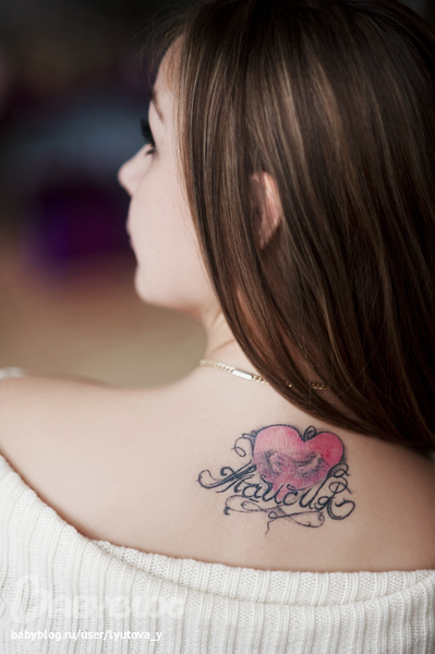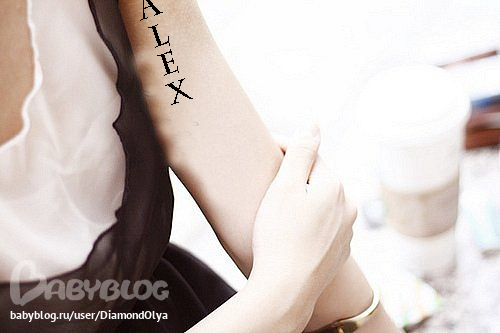 На шее и запястье имена детей у всех. Посмотри в сообществе здесь, прямо у каждой второй, даже первой. Попсово уже. Мне первый вариант нравится.