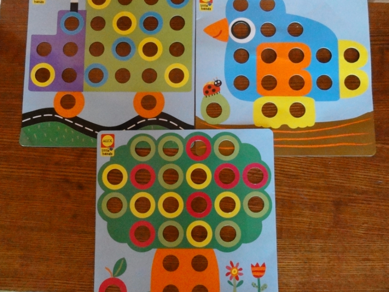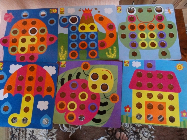 В наборе: 10 картинок с дырочками для цветных "пуговиц", 46 разноцветных пластмассовых кнопок (пуговиц).