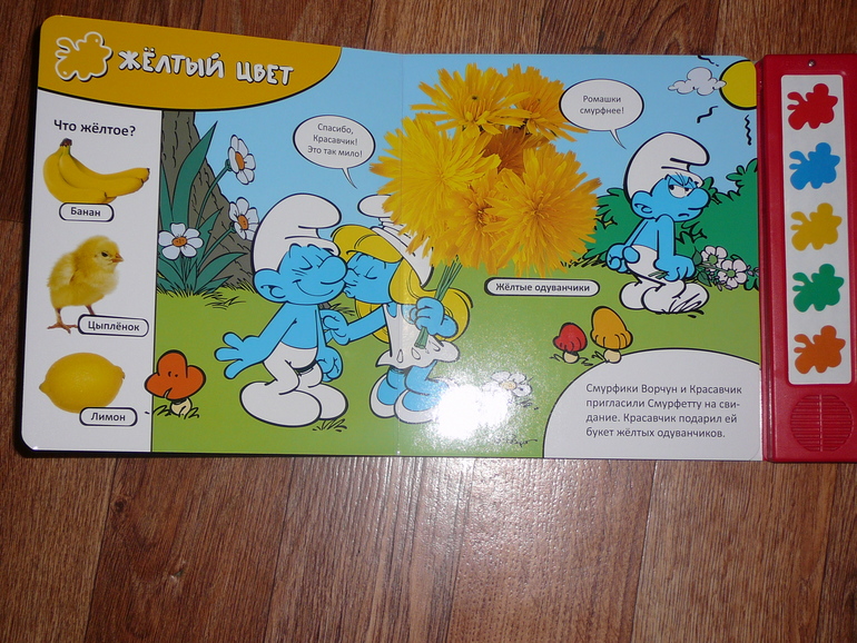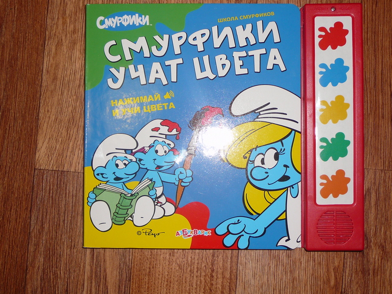 ".Яркая книга с веселыми смурфиками. Каждому цвету в книге выделен разворот,изображены предметы данного цвета.Цвета проговариваются.