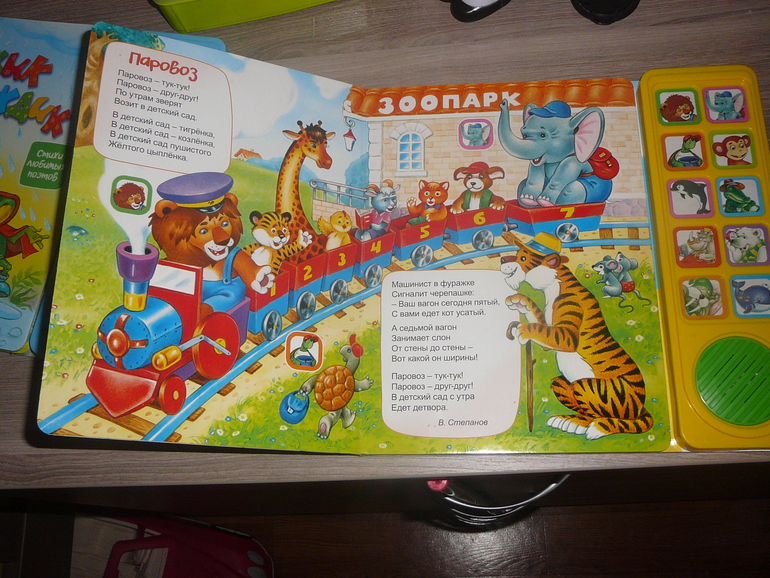 Книги "Мохнатый зоопарк" и "Ежик и дождик" немного разочаровали тем,что в них нет озвучки стихов,а только голоса животных.Стихи надо самим читать.Оставила их на подарки.