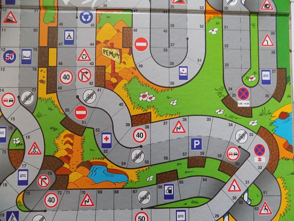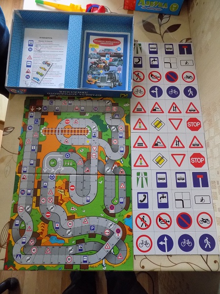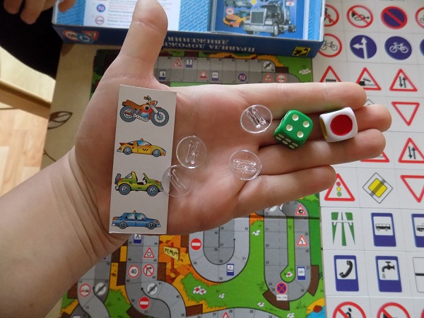 Еще один подарок на ДР. Ходилка на тему машинок. В наборе 4 карточки с машинками, 4 подставки, 2 кубика. На цветном кубике три цвета светофора - красный, желтый, зеленый.