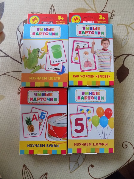 Очень мне нравится серия Умных карточек. Кроме тех что на фото у нас есть еще три набора (Я и мое тело, Противоположности, Профессии). Карточек много, все двусторонние. Есть инструкция как играть.