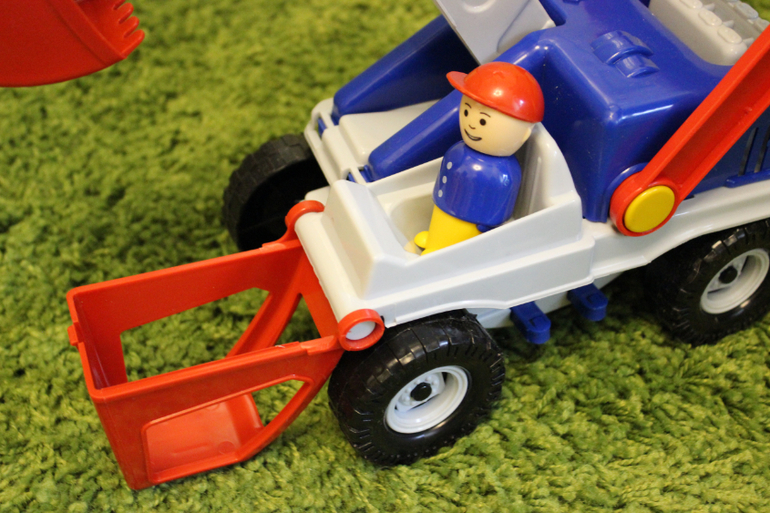 Наше последнее приобретение - экскаватор. Здесь к сожалению колеса пластиковые, но это не портит его совершенно. Кабинка открывается, можно посадить человечка (в комплекте не идет). Хороший ковш, но сам механизм (работает с помощью рукоятки) для почти 3-х летнего мальчика показался трудноватым, надо привыкать. Покупала для игры с песком - дома и на улице.