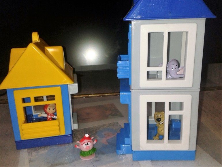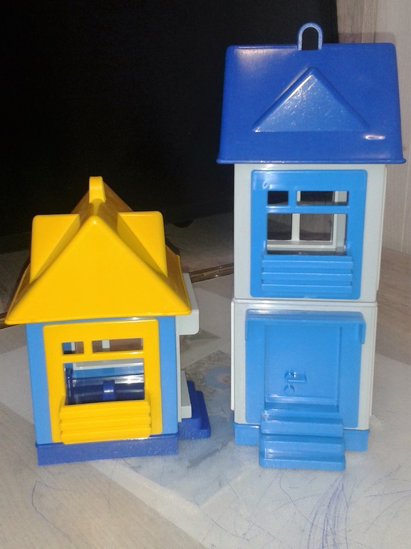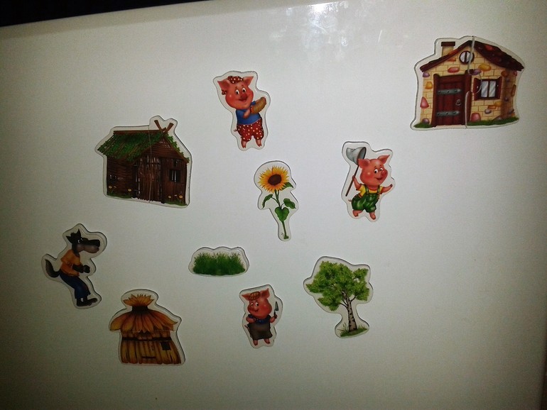 Магнитный театр "Три поросенка" с ним нам не повезло. Вынимая из коробки было видно что картинки от магнитов отклеились. И не одна, а половину была отклеена. Попробуем приклеить сами. Домики в виде пазлов остальные фигурки цельные.