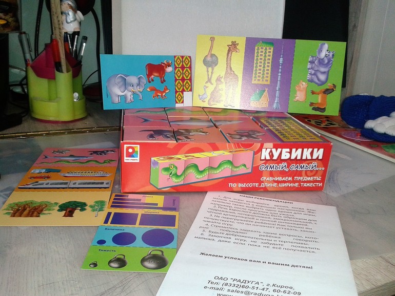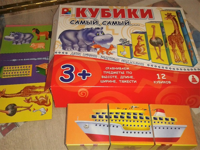 Кубики "Самый, самый" оказалось что они из плотного картона и моей их не дашь мы всю бумагу тянем в рот. Надеюсь к двум годам любовь к бумаге пройдет. Задумка очень интересная сравнивать предметы по высоте, длине. Прилагаются карточки