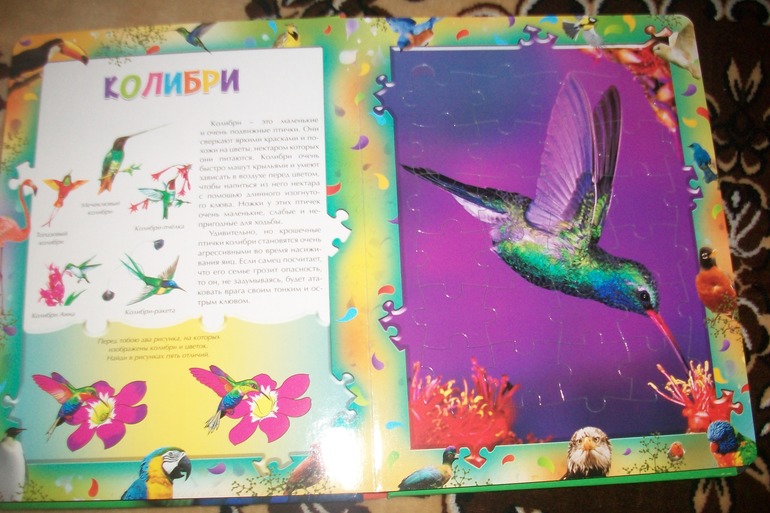 В книге есть информация про птиц, короткое задание и пазл. Всего 6 разворотов