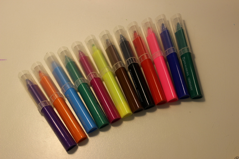 Фломастеры утолщенные 12 цветов Brauberg. Очень понравились! Яркие, толстые, держать четырехлетке очень удобно.